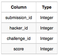 Submissions: The submission_id is the id of the submission, hacker_id is the id of the hacker who made the submission, challenge_id is the id of the challenge for which the submission belongs to, and score is the score of the submission.