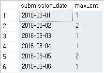 최종적으로 원하는 결과는 위에서 나온 결과 중에서 가장 많이 제출한 사람만을 찾는 것인데 이것을 위해 "일자별 최대 제출수"를 구한다.