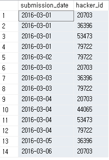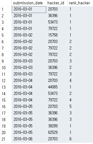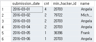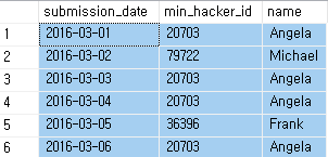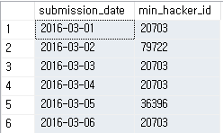 - min_hacker_id : 해당일에 제출한 사람 중 가장 많이 제출한 사람의 hacker_id