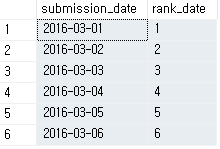 우선 "당일까지 매일 제출한 사람의 수"를 구해보자. 시작일인 3/1일까지 매일 제출한 사람은 1번 제출한 사람일 것이고, 3/2일까지 매일 제출한 사람은 3/1~3/2일 이렇게 2번 제출한 사람이다. 이런 식으로 한다면 3/6일까지 매일 제출한 사람은 3/1~3/6일까지 6번 제출한 사람이 된다. 이렇게 매일 제출해야 하는 과제의 수는 아래와 같이 일자별로 1씩 증가되는 값이 될 것이다. distinct(submission_date)를 기준으로 rank를 매기면 일자별로 1씩 증가되는 값을 얻을 수 있다.